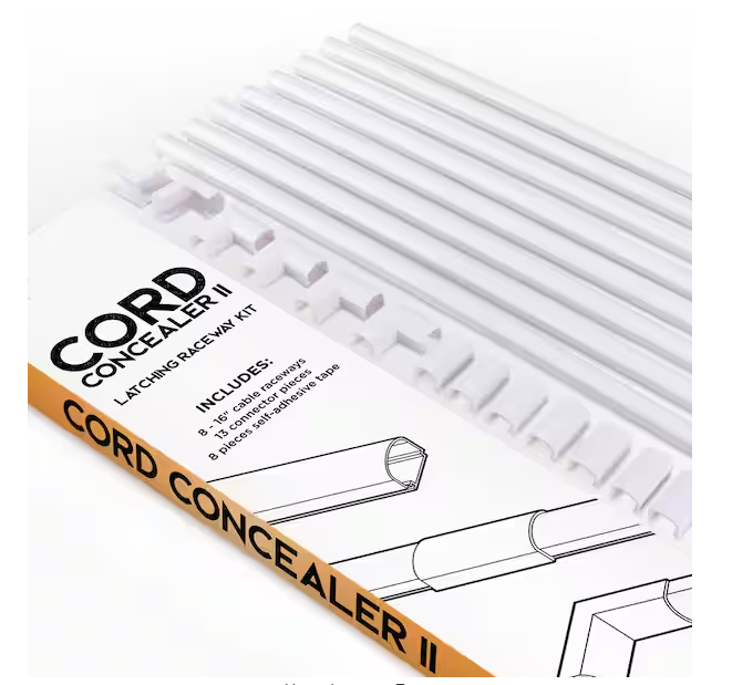 - Includes eight 16-in. latching raceway channels, 13 connectors and self-adhesive tape strips