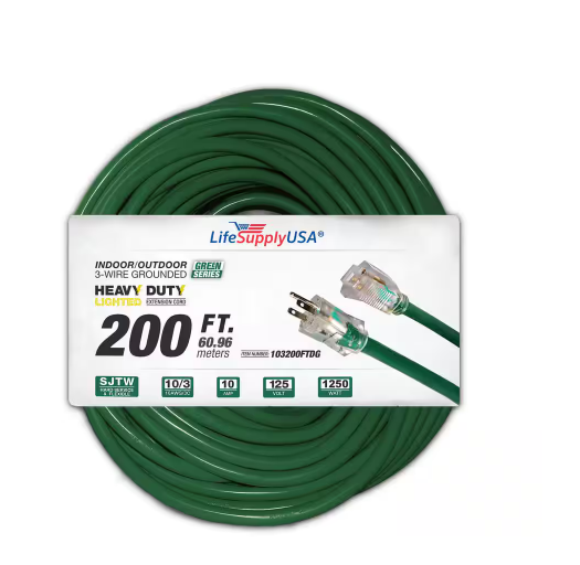 - GREAT VALUE: 200 ft Extension cord 10/3 SJTW with Lighted end - Green - Indoor/Outdoor Heavy Duty Extra Durability 10AMP 125V 1250W ETL listed by LifeSupplyUSA