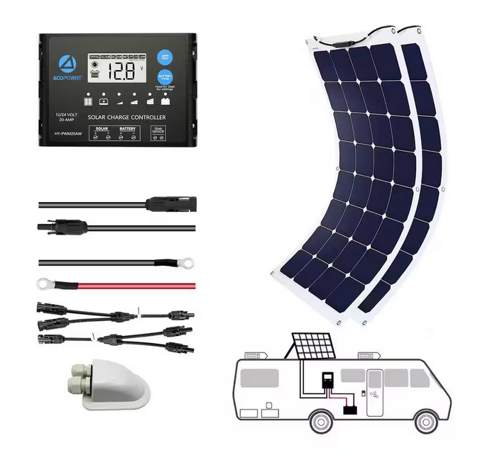 - Complete kit includes: 2 x 110-Watt 12-Volt flexible solar panel, 20 Amp PWM waterproof charge controller, 30 ft. 10 AWG solar adaptor kit, 8 ft. 10 AWG tray cable, cable entry housing, 1-pair PV T/Y connectors