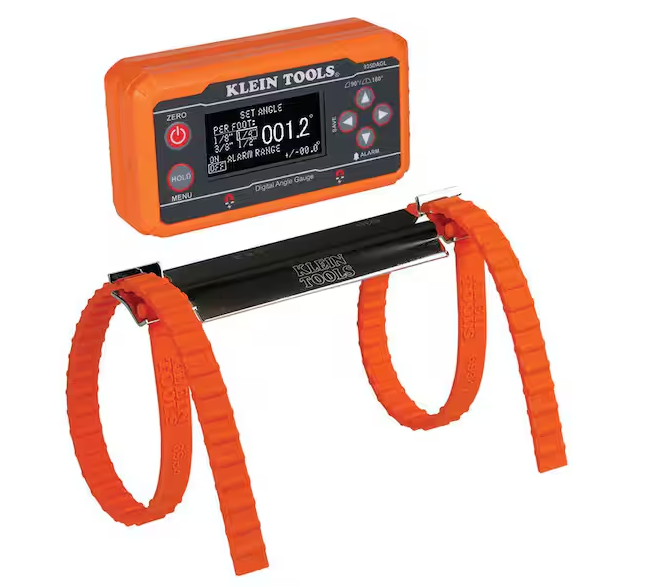 - Digital level (Cat. no. 935DAGL) measures 0° to 90°, 0° to 180°, or dual axis bullseye ranges