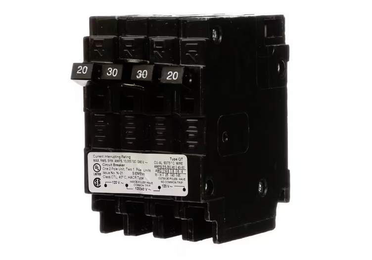 Triplex 2-Outer 20 Amp Single-Pole and 1-Inner 30 Amp Double-Pole Circuit Breaker - 9328101